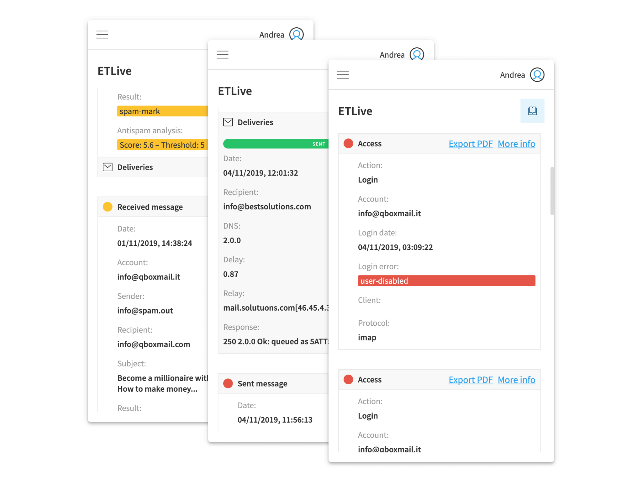 ETLive è una soluzione che permette di effettuare l’analisi in tempo reale dei log (registri) relativi al traffico email in entrata e in uscita, in questo modo si hanno sempre sotto controllo i login degli account e si ha la possibilità di monitorare gli accessi ai servizi per evitare abusi o tentativi di violazione da parte di utenti malintenzionati.