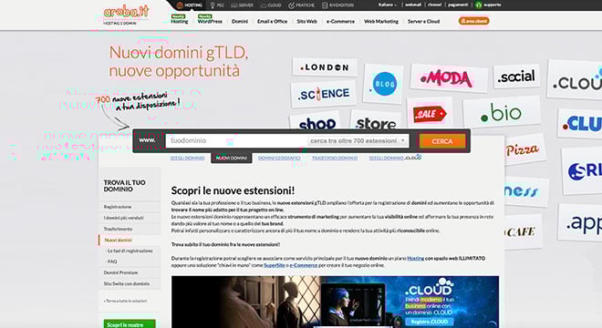 - Aruba – permette di registrare un dominio con le nuove estensioni introdotte dall’ICANN, consentendo di scegliere tra diversi pacchetti e servizi.