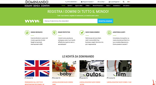 - Dominiando – azienda specializzata nella gestione dei nomi di dominio, consente di effettuare la registrazione scegliendo tra più di mille estensioni di dominio.