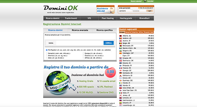 Nel momento in cui scriviamo il prezzo base è di 5,99 Euro all’anno per alcune estensioni in promozione, mentre, per quanto riguarda le estensioni "classiche", il costo è di 8,99 Eu + IVA all’anno per il dominio .it e 10,99 Eu + IVA all’anno per il .com (il listino completo dei prezzi dei domini su DominiOK è disponibile a questa pagina).