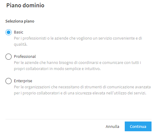 I Piani dominio disponibili sono 3. Si parte dal "Basic", il più adatto alle necessità dei professionisti e delle aziende che desiderano disporre di funzionalità essenziali, per poi passare al "Professional", pensato per le imprese che hanno esigenze particolari per quanto riguarda il coordinamento dei team, e all’"Enterprise", ideale per le realtà più strutturate.