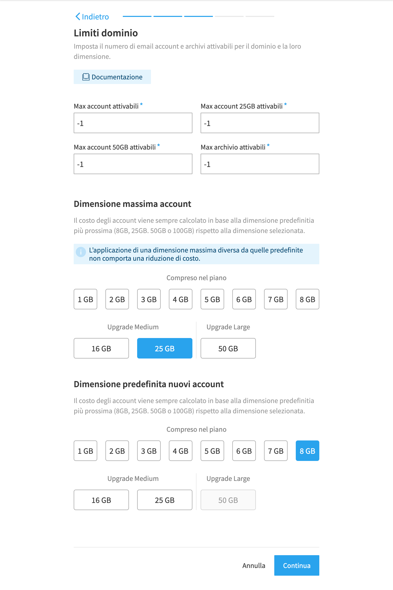 Dopo aver cliccato su "Continua" si può proseguire definendo i limiti da attribuire al dominio, indicando al sistema quanti account potranno essere attivati e quanti archivi. Degli account si può stabilire anche la dimensione massima in GB e quella predefinita per i nuovi.