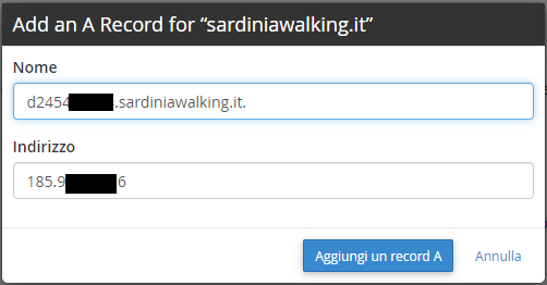 Ora che il nuovo dominio è disponibile, il sistema metterà a disposizione i parametri (nome e indirizzo) necessari per aggiungere un nuovo record A ai DNS (Domain Name System) del dominio stesso. Accediamo quindi alla gestione DNS fornita dal nostro hosting provider ed effettuiamo l’operazione richiesta.