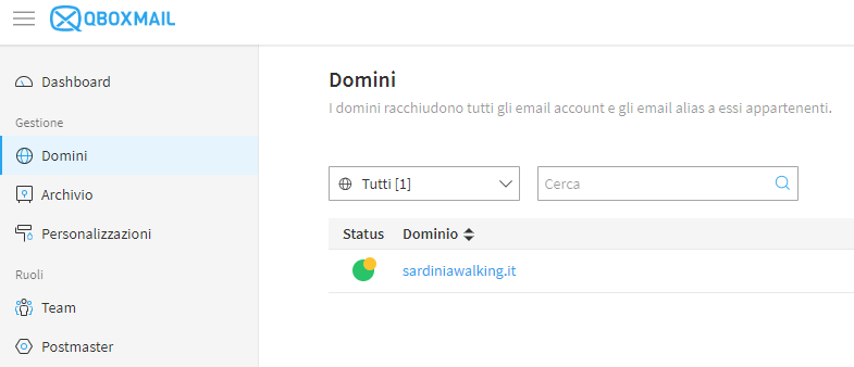 I DNS hanno il compito di tradurre i nomi a dominio in indirizzi IP e consentono a Qboxmail di interagire direttamente con il traffico email del nostro dominio. Quello descritto è quindi un passaggio necessario per accedere agli account di posta elettronica che si desidera gestire, una volta completata il dominio creato sarà visibile nell’elenco presente nella sezione "Domini".