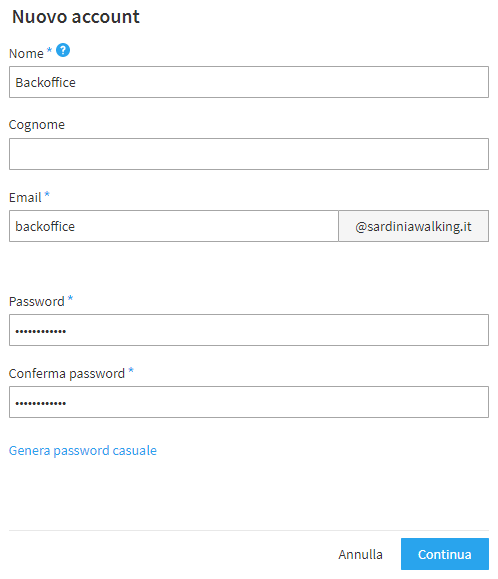 Per aggiungere un nuovo account Email tramite il Panel clicchiamo sul nome del dominio appena creato e successivamente su "+Account Email". Nel form così aperto si devono inserire pochi dati tra cui nome e cognome (o solo il nome nel caso l’account non sia associato ad una persona), l’indirizzo email e la password per l’autenticazione.