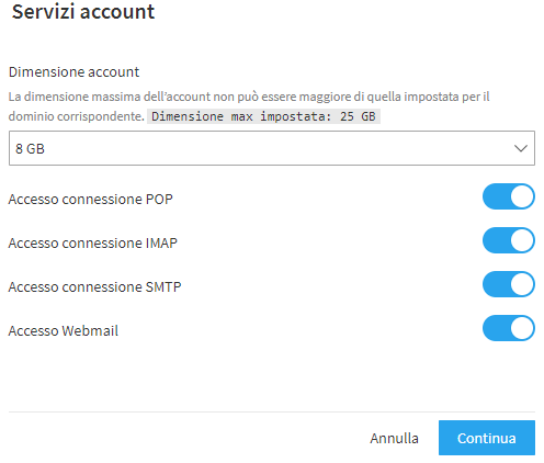 Una volta inseriti i parametri richiesti e cliccato su "Continua" si devono selezionare i servizi attivi per l’account corrente, cioè la dimensione massima dell’account e i protocolli di accesso consentiti per quest’ultimo.
