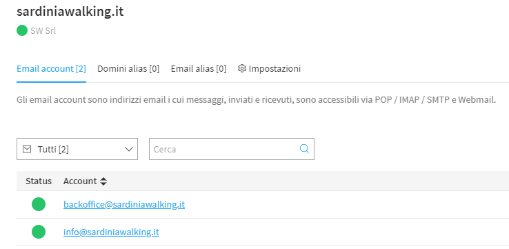 Tutti gli account così creati divengono accessibili cliccando sul nome del dominio associato a su volta disponibile nella sezione "Domini".