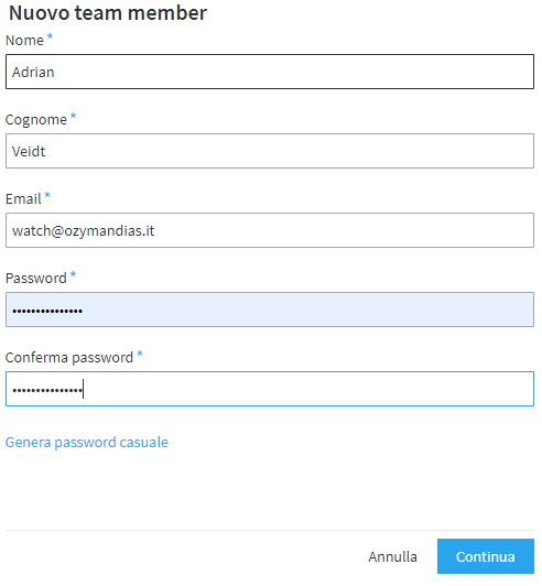 Una volta cliccato su "Crea" il nuovo team member verrà creato immediatamente e riceverà un’email contenente tutte le informazioni necessarie per iniziare a lavorare tramite il pannello di controllo rispettando i permessi a lui concessi.