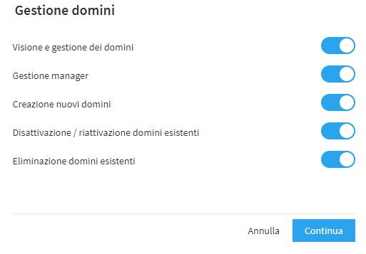 Una volta inseriti i dati richiesti e cliccato su "Continua" si possono definire i privilegi del nuovo team member per la gestione dei domini. A seconda dei permessi che gli si vuole accordare è possibile permettergli di visualizzare e gestire i domini, di accedere alla loro gestione, di creare nuovi domini così come di disattivare (o riattivare) ed eliminare i domini esistenti.