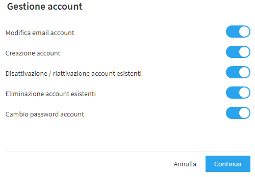 La fase successiva riguarda i permessi per la gestione degli account che, a seconda dei privilegi assegnati, permettono di modificare le caselle di posta elettronica, creare nuovi account, disattivare (o riattivare) ed eliminare account esistenti nonché di modificare le password di accesso.