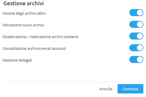 Cliccando su "Continua" si passa ai permessi di gestione degli archivi, grazie ai quali stabilire se il nuovo team member ha la possibilità di visualizzare gli archivi attivi, attivare nuovi archivi, disattivare (o riattivare) e cancellare archivi. Interessante anche l’opzione che consente al componente creato di gestire eventuali delegati.