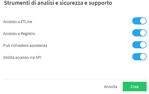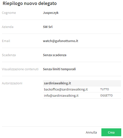 Nell’ultimo passaggio viene proposto un riepilogo riguardante le caratteristiche del nuovo delegato. Dopo aver cliccato su "Crea" il delegato riceve le sue credenziali per email e viene abilitato da subito.