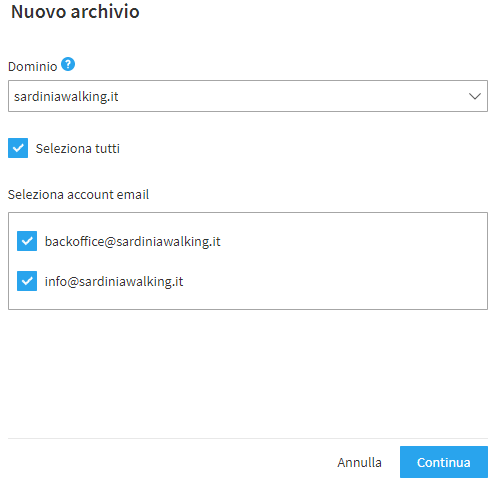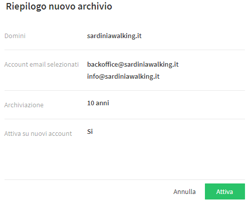 Per attivare un nuovo archivio è necessario seguire il percorso "Archivio > Attiva archivio" dal pannello di controllo. Viene così richiesto di selezionare il dominio e gli account email da associare all’archivio, il numero di quest’ultimi dipende dalle impostazioni definite per il dominio selezionato. Si tenga conto che durante l’abilitazione dell’archivio è possibile decidere se estenderne o meno l’attivazione anche per i nuovi account.