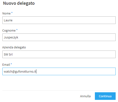 Per creare un nuovo delegato è possibile seguire il percorso "Delegati (sezione "Ruoli" della sidebar") > Crea delegato". Il form per la sua creazione prevede l’inserimento di pochi dati (nome, cognome, azienda ed email) che devono essere digitati prima di cliccare su "Continua".