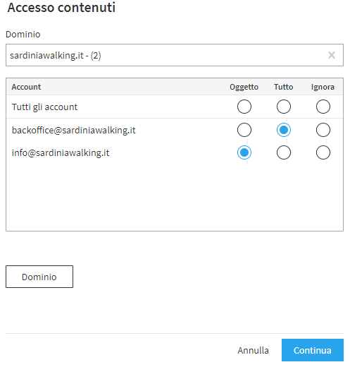 Una volta settati i limiti temporali e cliccato su "Continua" si passa alla fase che consente di definire i permessi di accesso ai contenuti degli account di un determinato dominio o di più domini. Sono disponibili 3 livelli di accesso: