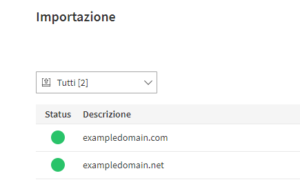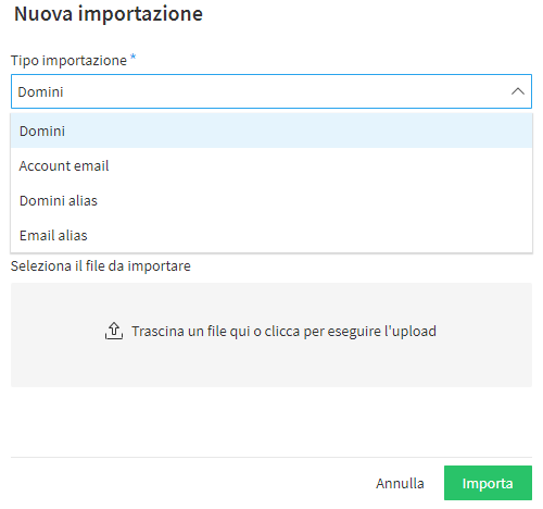 Il sistema richiede di specificare il tipo di importazione da effettuare (ad esempio interi domini o degli account email) e di selezionare il file da importare per poi cliccare su "Importa". Fatto questo le informazioni importate divengono disponibili tramite la sezione "Importazioni" della Dashboard.