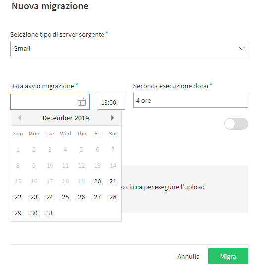 E’ possibile selezionare diverse tipologie di server sorgente (Gmail, Office 365, Exchange, SSL standar e non standard), sono inoltre programmabili la data e l’ora per l’avvio della migrazione e l’intervallo di tempo precedente alla seconda esecuzione della migrazione.