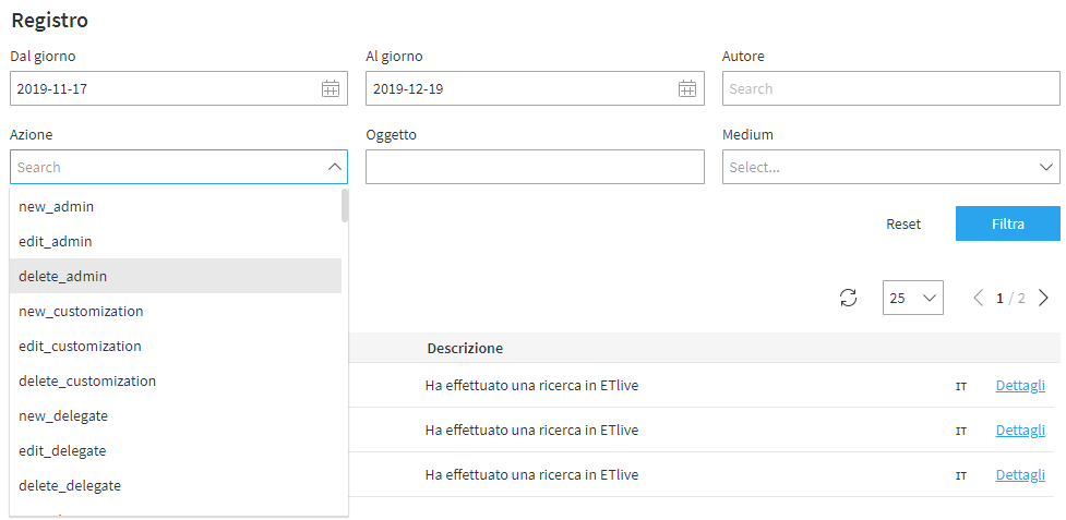 Anche in questo caso il sistema consente di consultare il registro sulla base di un determinato intervallo di tempo, vi è poi la possibilità di filtrare l’output in base di un’azione specifica (ad esempio la creazione o la modifica di un delegato), dell’autore di un’azione o del medium utilizzato per l’attività (il Panel stesso, un’API o il Webmail).