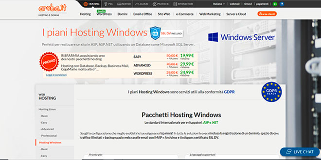 - Hosting Windows Advanced – Comprende un dominio con spazio e traffico illimitati, possibilità di creare illimitate caselle di posta elettronica, 20 caselle gigamail (da 5GB ciascuna), 5 caselle PEC (da 1GB ciascuna), 1 database MSSQL da 1GB nel momento in cui scriviamo al costo scontato di 29,99 Eu + IVA all’anno (invece di 70,00 Eu + IVA all’anno).
