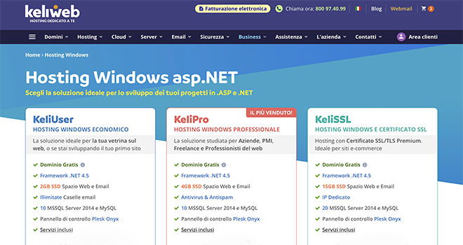 Anche Keliweb propone diverse offerte di piani hosting Windows per soddisfare le esigenze di aziende e professionisti che desiderano creare il proprio progetto on-line sfruttando la potenza dei linguaggi ASP e ASP.NET.