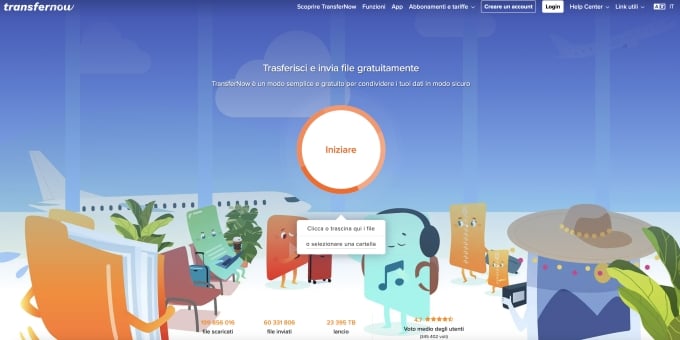 TransferNow è un modo semplice e gratuito per condividere i tuoi dati in modo sicuro. Inviare i tuoi file è semplicissimo: 1) Clicca su Start per selezionare i file e i documenti da inviare o trascinali sull’interfaccia. 2) Invia file ai contatti e ottieni un link di condivisione personalizzabile. La piattaforma propone funzionalità diverse a seconda delle tue esigenze. 3) Una volta completato il modulo di condivisione dei file, clicca sul pulsante Trasferire per confermare le informazioni di trasferimento e iniziare a caricare i tuoi documenti. Nel giro di pochi secondi i tuoi file di grandi dimensioni verranno recapitati ai destinatari!