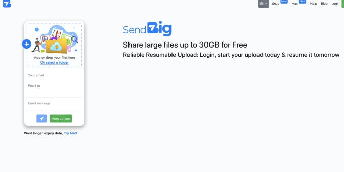 SendBig è un applicazione on-line che consente di trasferire file di grandi dimensioni tramite un semplice messaggio mail. Il funzionamento è molto semplice: si carica il file e si compila il modulo specificando la mail del mittente, quella del destinatario (è consentito specificare più destinatari) ed opzionalmente un subject ed un messaggio di accompagnamento.