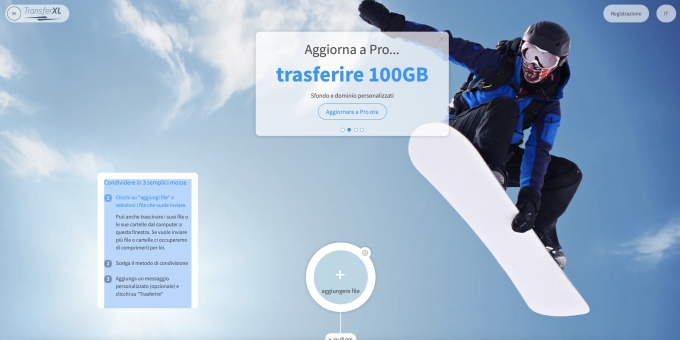 Con TransferXL è molto semplice e veloce inviare file di grandi dimensioni. Per condividere grandi Files bastano 3 semplici mosse: selezionare i Files da trasferire e trascinarli nella finestra del browser (è possibile anche trascinare intere cartelle), scegliere il metodo di condivisione (email o link) e, infine, aggiungere un eventuale testo di accompagnamento. Con un account PRO è possibile trasferire fino a 100GB in un colpo solo!