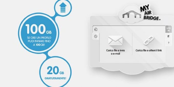 MyAirBridge.com è un servizio gratuito che consente, anche senza registrazione, di inviare file di grandi dimensioni tramite mail. Il limite massimo per i file è di 20Gb nella versione gratuita e di 100Gb per la versione a pagamento.