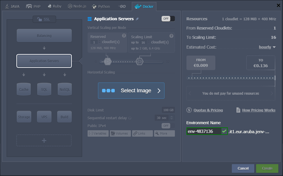 Grazie alla sua natura PaaS, Jelastic Cloud supporta l’impiego di tutti i principali linguaggi di sviluppo e programmazione nonché dei framework e degli engine più utilizzati dagli sviluppatori, come per esempio Java, PHP, Node.js, Ruby, Python, Docker e Kubernetes. In tutti i casi l’utilizzatore ha la possibilità di creare e configurare in pochi click l’environment più adatto alle proprie esigenze.