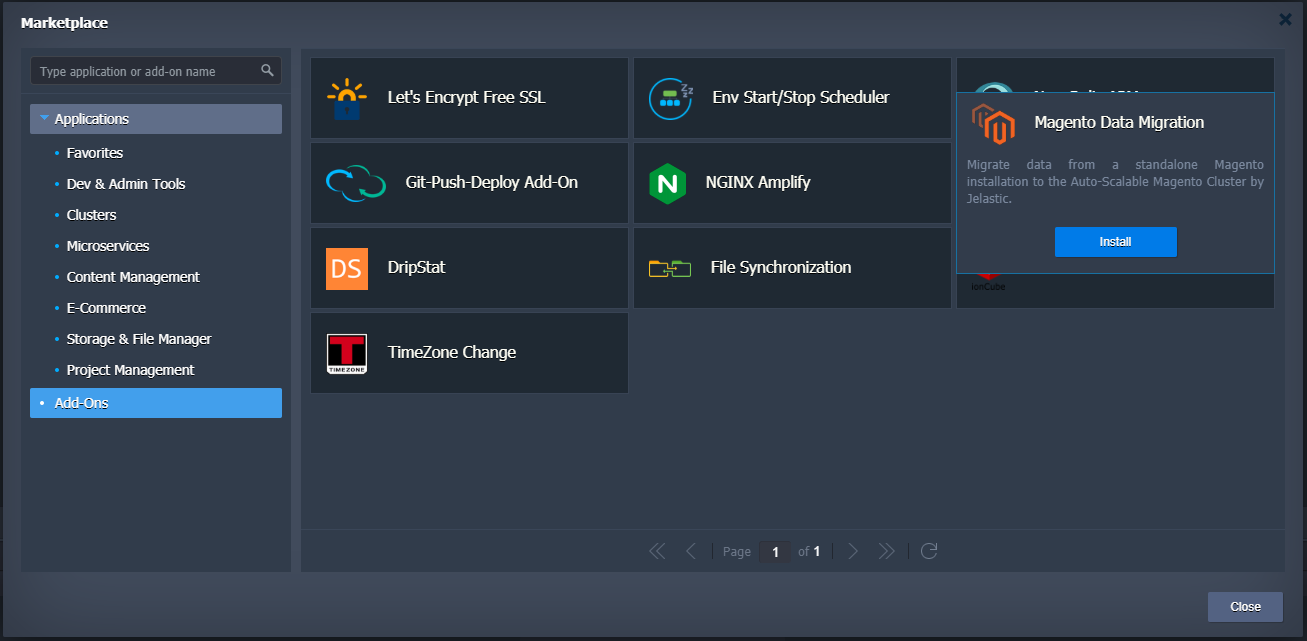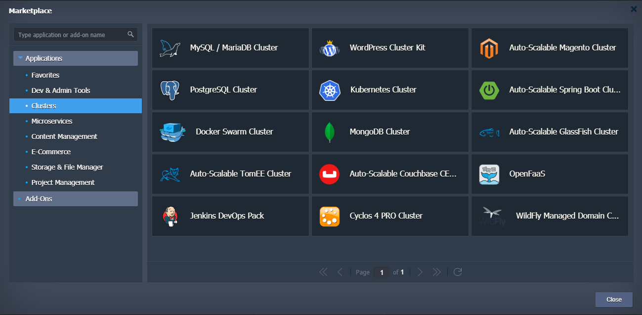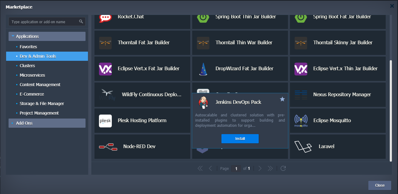 Jelastic Cloud è dotato, inoltre, di un marketplace dal quale è possibile installare, con un semplice click, decine di software ed estensioni utili all’implementazione di un’applicazione o di un servizio.
