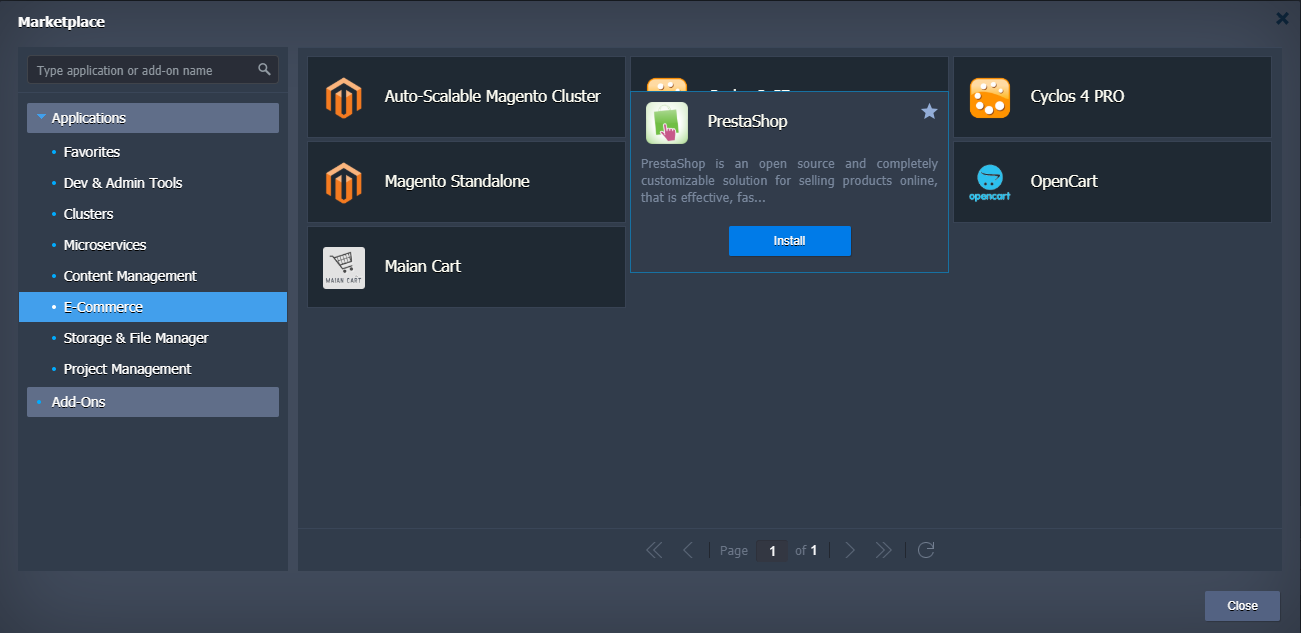 Sempre per quanto riguarda gli strumenti basati su PHP e MySQL, il marketplace consente di generare con un singolo click un progetto basato su PrestaShop, un e-commerce engine libero e aperto, e molto semplice da utilizzare, che per le sue performance particolarmente competitive viene scelto spesso dai professionisti del settore.