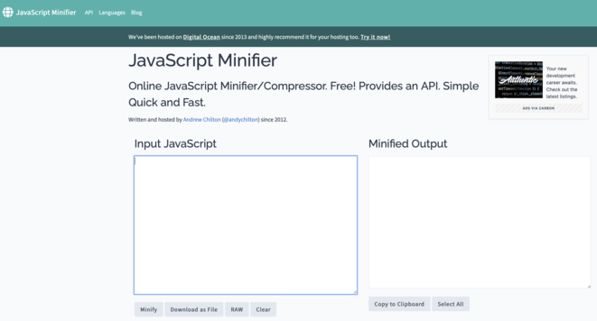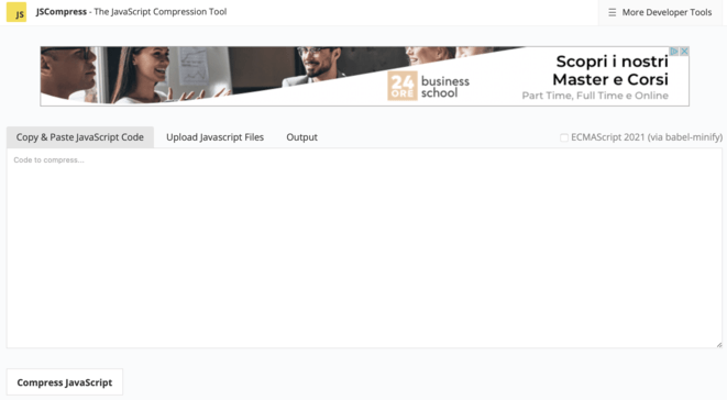 Offre la possibilità di effettuare l minimizzazione di un codice Javascript attraverso il semplice copia incolla del codice sorgente originario. Supporta le novità di ECMAScript 2021.