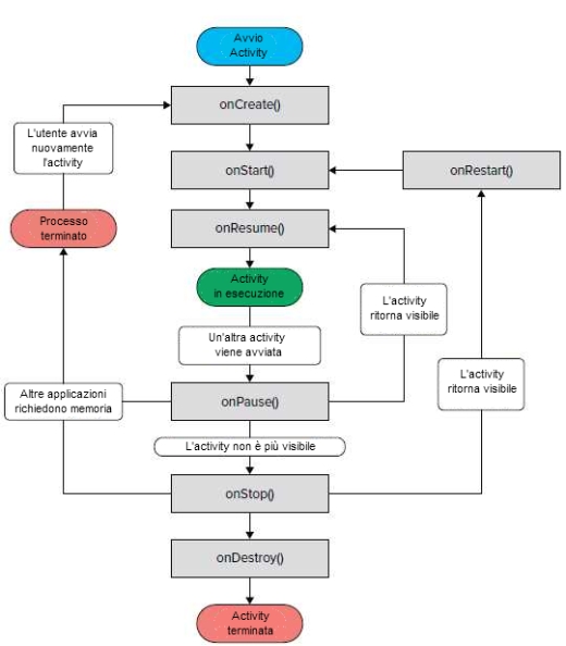 Di seguito un’immagine che riassume il ciclo di vita di un’activity con la sequenza dei suddetti eventi