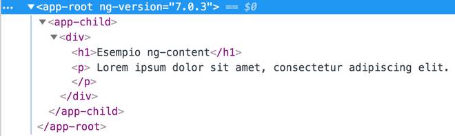 All’interno del template di ParentComponent inseriamo i tag di apertura e chiusura <app-child> che racchiudono un paragrafo e un’intestazione di primo livello. Questi due elementi verranno inseriti nel template del componente ChildComponent al posto di <ng-content>.