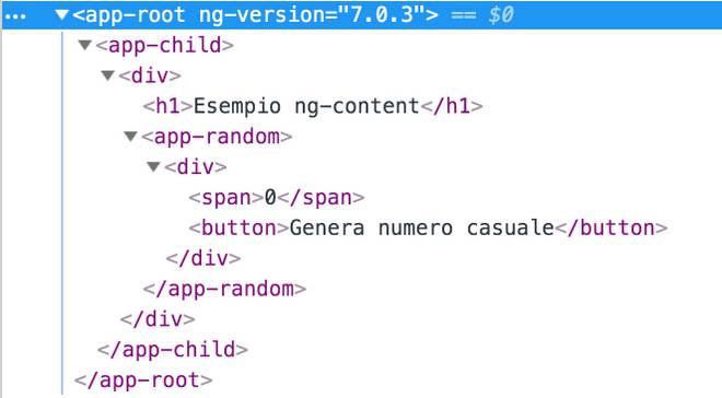 I vari elementi racchiusi fra i tag <app-child> vengono distribuiti nei diversi <ng-content> in base all’attributo select di questi ultimi. I due elementi <button> e <span> finiscono nell’ordine in cui compaiono in ParentComponent all’interno dell’ultimo <ng-content>.