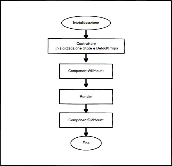 Il costruttore è il primo metodo che viene chiamato. Per una corretta inizializzazione, all’interno del costruttore di un componente, dovremo innanzitutto invocare il costruttore della classe base super(props) (come abbiamo visto definiamo un componente estendendo React.Component) passando le props ricevute dal componente. Sempre in questa fase, verranno assegnati i valori di default alle props che abbiamo definito tramite l’oggetto defaultProps. (es. App.defaultProps = {prop1: ‘valore1’}) Verrà quindi inizializzato l’oggetto state.