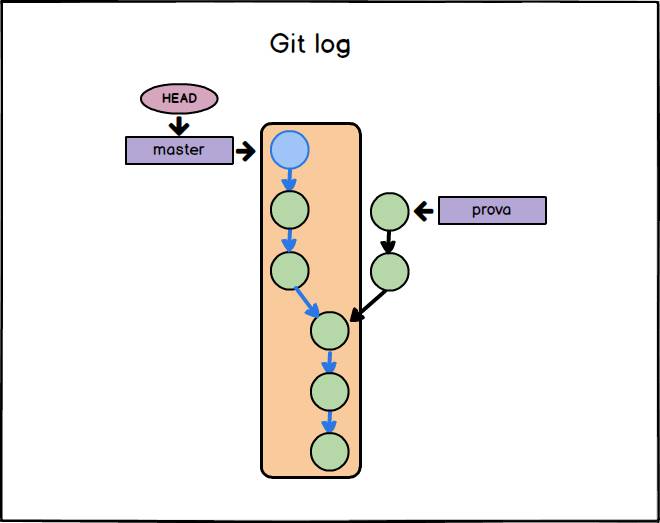 Anche se parleremo in maniera approfondita dei branch a partire dalla prossima lezione, ricordiamo che un branch è semplicemente un riferimento a un commit. Grazie ai branch è possibile avere uno sviluppo non lineare del progetto e quindi avere dei commit che non appartengono a un branch. Facendo riferimento all’immagine in alto, se eseguiamo il comando git log a partire dal commit corrente (nell’immagine il commit corrente è quello blu) verranno mostrate delle informazioni sui commit inclusi all’interno del rettangolo arancione. Riprendiamo l’esempio visto nella quarta lezione di questa guida e lanciamo il comando git log.
