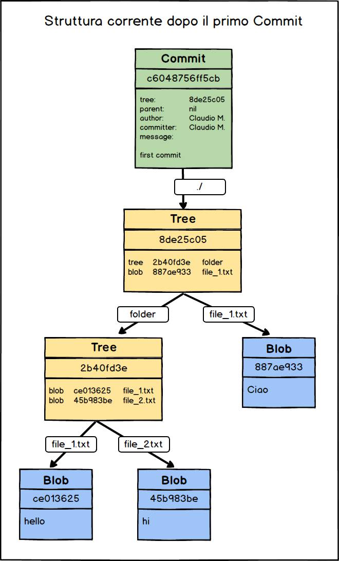 Vediamo quindi qual è la struttura corrente degli oggetti salvati da Git attraverso un’immagine.