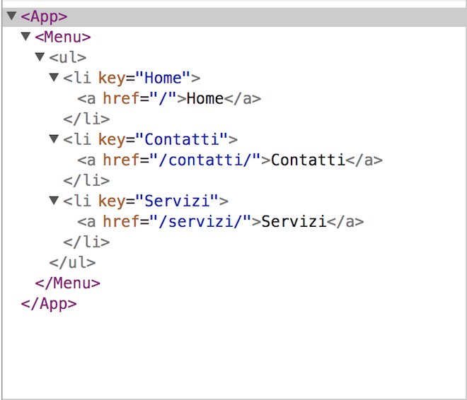 Abbiamo visto come utilizzare props.children all’interno dei nostri componenti. Consideriamo un altro esempio. Creiamo un componente Menu all’interno del quale utilizzeremo props.children per accedere ai link (elementi <a href="">Nome link</a>.) che passeremo come discendenti dell’Elemento React <Menu></Menu>.