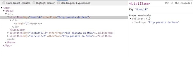 Definiamo tre componenti: App, Menu e ListItem. All’interno del componente Menu avremo accesso a props.children che sarà un array di elementi React, corrispondenti ai link discendenti dell’elemento <Menu> </Menu>. All’interno del componente Menu, usiamo la funzione React.Children.map() e passiamo props.children come primo argomento. Il secondo argomento sarà una funzione che riceverà, uno alla volta, gli elementi dell’array props.children. Ogni elemento sarà inserito come discendente di <ListItem>, passato poi come primo argomento della funzione React.cloneElement(). Il risultato di ogni chiamata alla funzione func() sarà un nuovo elemento <ListItem /> con attributi key e otherProp che saranno accessibili, all’interno del componente ListItem attraverso l’oggetto props.