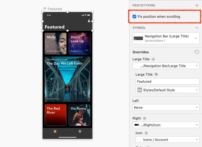 Se quindi attiviamo questa opzione per i simboli Navigation Bar e Tab Bar dell’artboard Featured, il resto del contenuto scorrerà sotto questi ultimi.