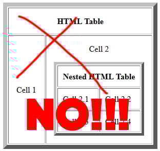 Un altra pratica da evitare è la creazione di layout basati sull’utilizzo del tag <table>. Questa tecnica, infatti, è assolutamente deprecabile e deve essere accantonata a vantaggio dei più moderni layout tableless. Le tabelle di HTML, infatti, non sono state inventate per creare layout ma per fornire agli sviluppatori di pagine web una "griglia" dove presentare dei report di dati.
