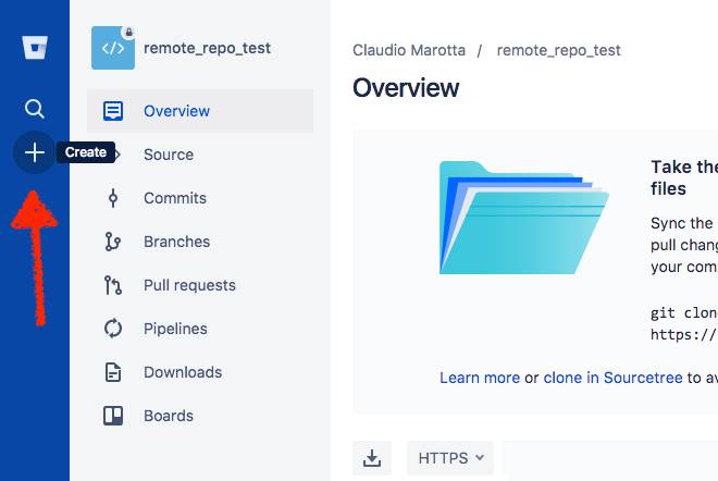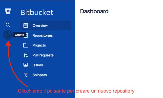 A questo punto abbiamo il solito repository sul nostro computer. Se vogliamo creare un repository remoto a partire dal repository locale in maniera semplice e veloce, possiamo usare uno dei servizi di hosting di repository. Github è sicuramente la piattaforma più conosciuta. Vista l’enorme quantità di materiale e informazioni che si trovano online su Github e dato che le funzionalità sono simili, in questa guida vedremo come usare Bitbucket. Registriamo quindi un nuovo account, ed accediamo alla Dashboard in cui possiamo creare un nuovo repository sul server.