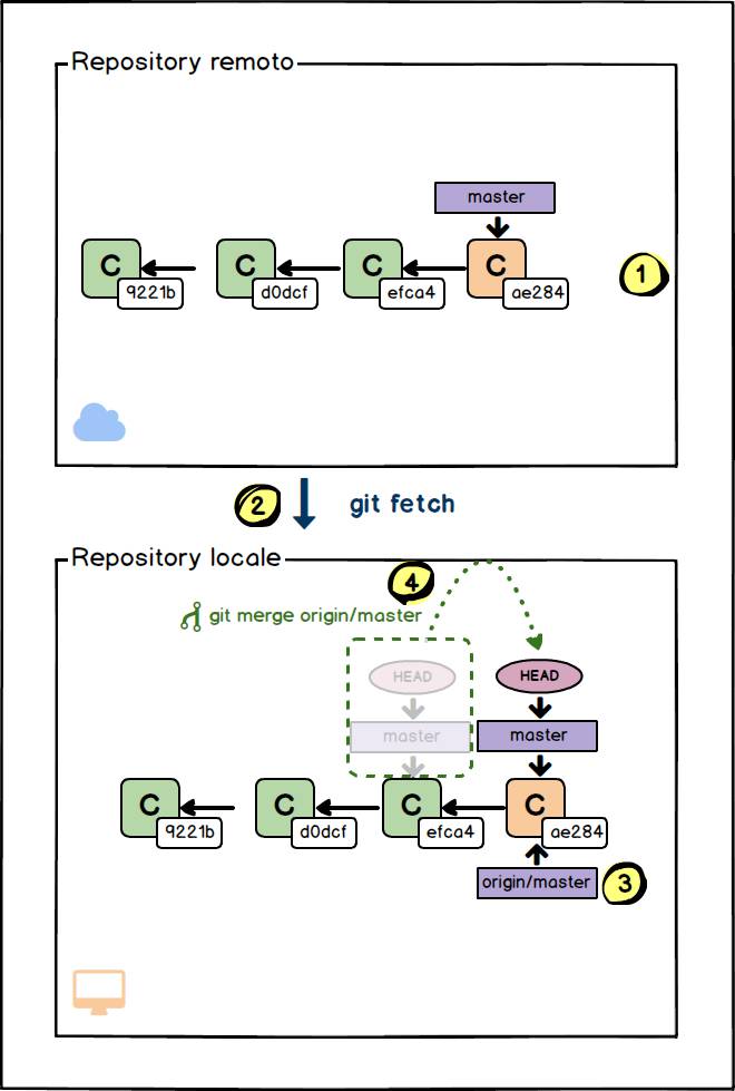 Se vengono aggiunti nuovi commit al repository remoto da altri collaboratori, il branch master del repository remoto viene aggiornato, ma il branch origin/master non viene modificato fin quando non viene effettuato il comando git fetch che recupera le informazioni aggiornate dal repository remoto. Dopo il comando git fetch vengono recuperati dal repository remoto eventuali nuovi commit e viene in caso modificato il valore di origin/master, ma non del branch master. Se vogliamo incorporare le modifiche di origin/master nel branch master, dobbiamo eseguire git merge origin/master dal branch master.
