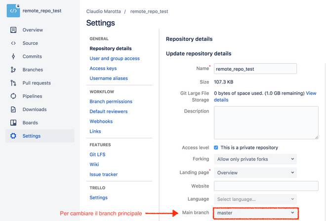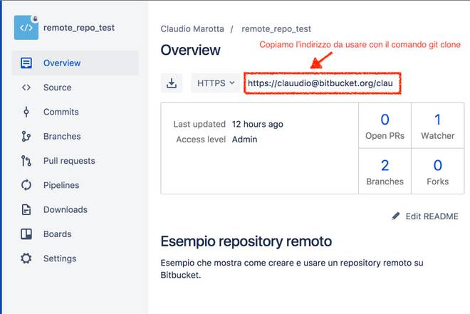 riepilogo e istruzioni per il nuovo repository creato su bitbucket