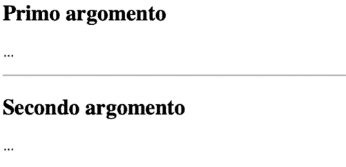 Normalmente il tag <hr> è utilizzato come separatore netto, cioè per identificare visivamente un cambio di argomento o per dividere elementi tra loro disomogenei. Vediamo un esempio: