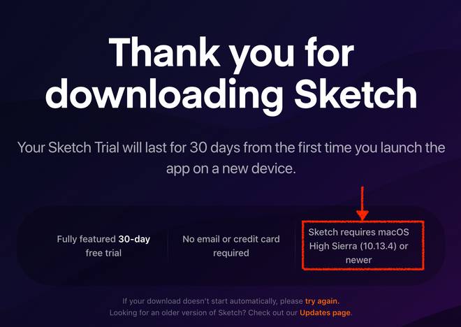 La versione 55 di Sketch richiede macOS High Sierra 10.13.14 o versioni successive. Per i sistemi operativi antecedenti a questi è possibile recuperare una versione precedente dall’apposita pagina ufficiale, raggiungibile all’indirizzo sketch.com/updates, prestando attenzione ai requisiti specificati sotto ogni rilascio.