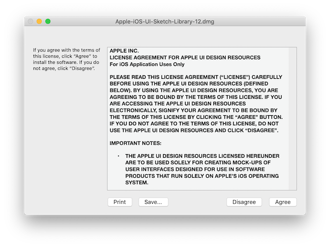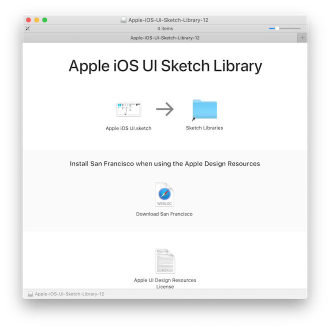 Dopo il primo avvio, possiamo completare un ulteriore passaggio opzionale, ovvero l’installazione della libreria ufficiale Apple iOS UI Design Resources, una collezione di elementi della UI di iOS che nelle ultime versioni di Sketch sostituisce il corrispondente template non più presente. (Nelle prossime lezioni affronteremo l’argomento delle librerie in maniera più approfondita)