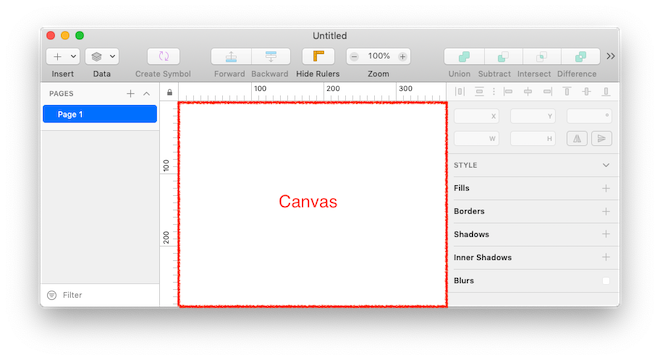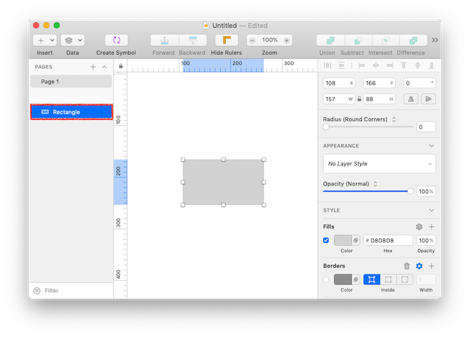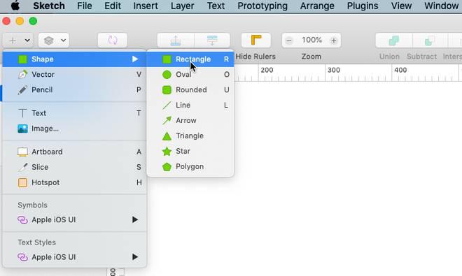 Per visualizzare meglio quanto descritto finora, apriamo un nuovo documento di Sketch e aggiungiamo un rettangolo nell’area di lavoro (Canvas) selezionando lo strumento Rectangle dal menu a comparsa ‘Insert > Shape‘ della barra degli strumenti. (In alternativa possiamo utilizzare la scorciatoia da tastiera corrispondente. Basterà premere il tasto ‘R’)