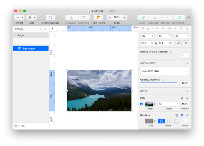Mentre il rettangolo è selezionato, possiamo inserire al suo interno un’immagine casuale come sfondo sfruttando la funzionalità Data presente in Sketch.